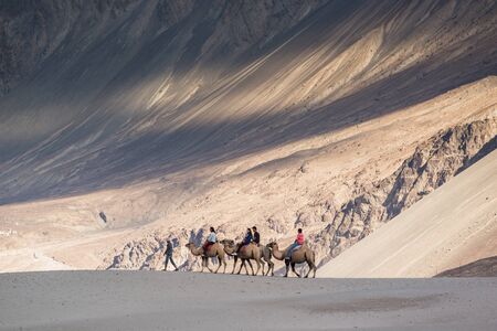 caravan travellers riding camels Nubra Valley Ladakh ,India - September 2014