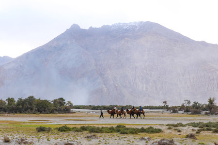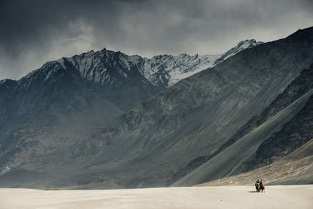 Camel safari with mountain in Nubra valley, Ladakh, India