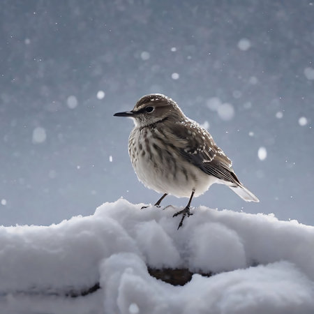 Snowy Bird (Tringa totanus) in the snow on tree branch. Solitary Bird Braving the Winter Snowfall