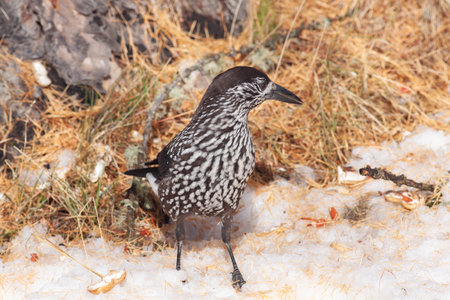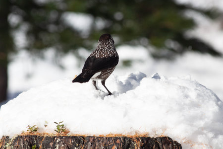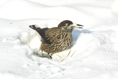 Spotted nutcracker (Nucifraga caryocatactes) in snow. Moscow region, Russia