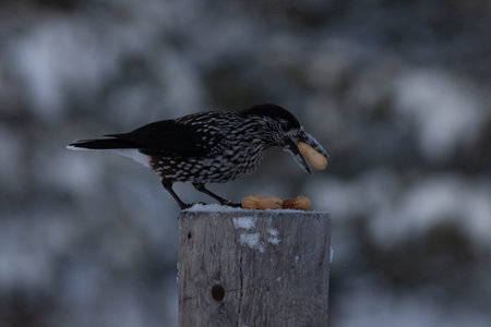 Spotted Nutcracker (Nucifraga caryocatactes) with a nut in her beak