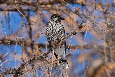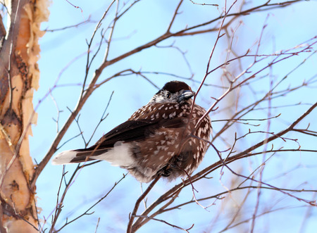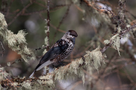 Nucifera caryocatactes perched on a branch in the winter forest.