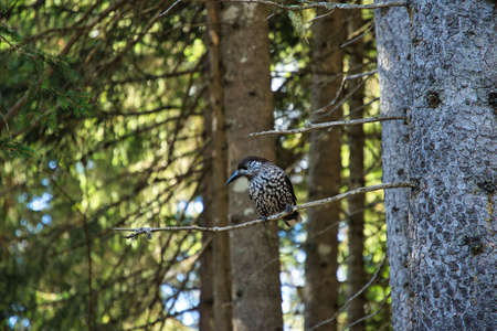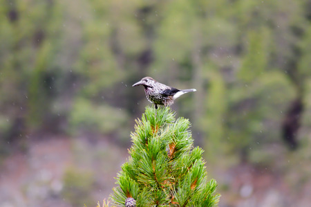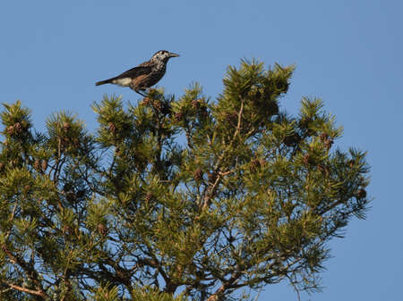Spotted nutcracker or Eurasian nutcracker (Nucifraga caryocatactes) sitting on top of a pine.