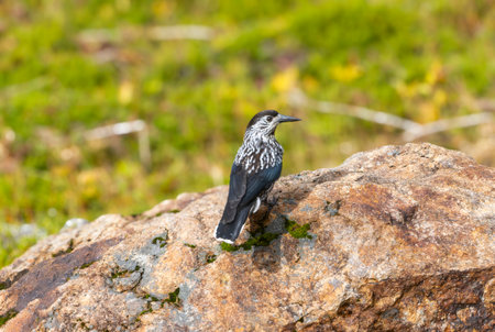 Spotted Nutcracker on a rock in the mountain.
