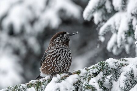 Nucifraga caryocatactes sitting on a snowy branch, the best photo.
