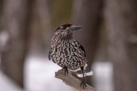 Spotted Nutcracker (Nucifraga caryocatactes) on the perch in winter forest.
