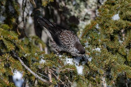 Nucifraga caryocatactes. Bird Nutcracker Sunny winter day sitting on the branches of a cedar