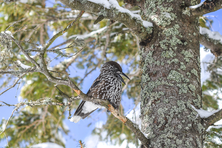 Spotted Nutcracker (Nucifraga caryocatactes) in winter forest.