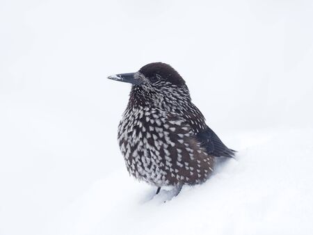 Spotted nutcracker, Nucifraga caryocatactes, single bird in snow, Bulgaria, February 2020