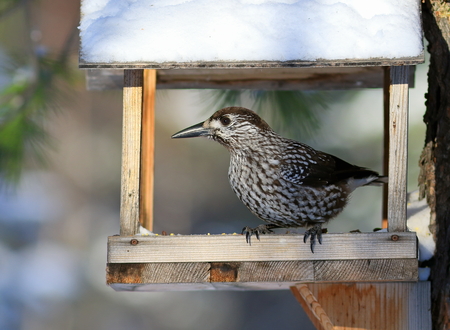 Nucifraga caryocatactes. The nutcracker in the trough for animals
