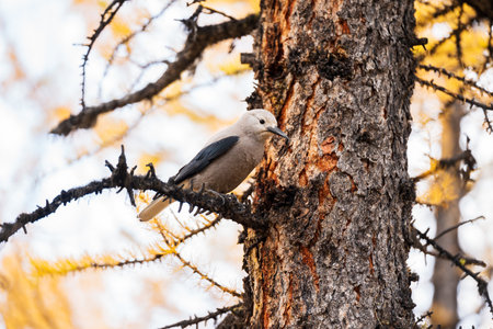 Clark's Nutcracker ( Nucifraga columbiana ) perching on a branch of yellow larch tree. Larch Valley, Banff National Park, Canadian Rockies, Alberta, Canada. Close-up shot.