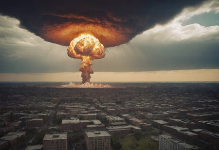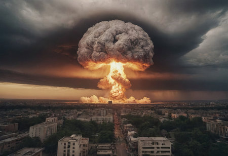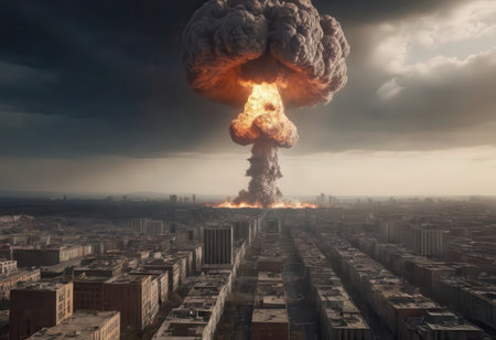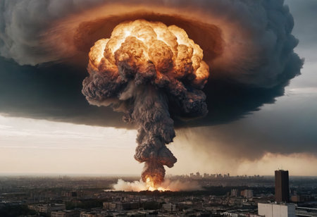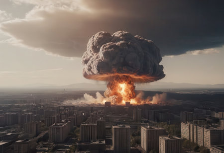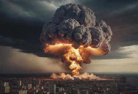 Mushroom cloud forming after atomic bombing, causing widespread destruction and radioactive fallout