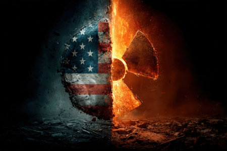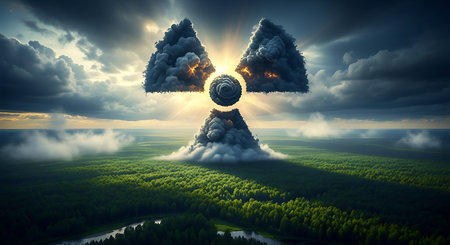 A distressed and fragmented radiation warning symbol breaks apart against a dark, atmospheric background, evoking themes of danger, decay, and environmental crisis.
