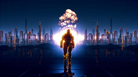 Man witnessing a giant atomic explosion. End of the world, armagedon concept with man and enormous fire explosion blast. Ai generated