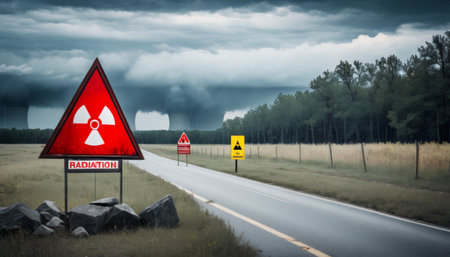 A stark landscape under stormy skies with warning signs indicating the presence of radiation, hinting at a foreboding environment.. AI Generation