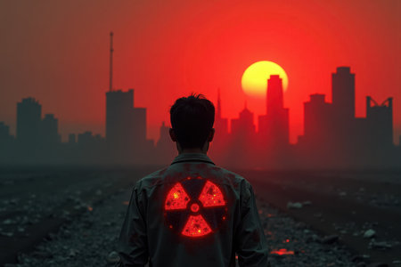 A striking image featuring a vibrant sunset over a desolate cityscape, highlighted by a radiation symbol and industrial structures, evoking feelings of decay and uncertainty.