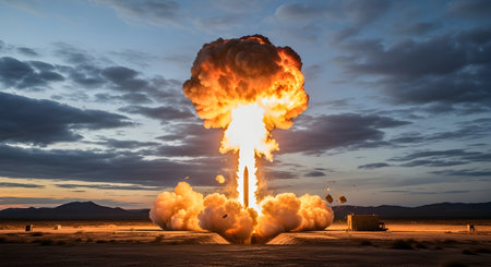 A powerful nuclear explosion generates a massive mushroom cloud, soaring high into a clear sky, creating a dramatic and intense visual effect over a vast, deserted landscape, illustrating the force and devastation unleashed.