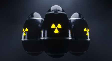 Three glossy black nuclear bombs, each prominently displaying a glowing yellow radiation symbol, arranged against a dark, somber background, symbolizing danger and global conflict.
