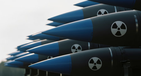 Multiple dark grey nuclear missiles with blue conical tips and radiation symbols lined up, symbolizing global conflict and military power.