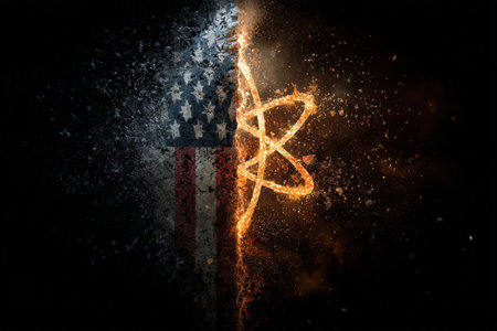Symbol of conflict between United States and Iranian. National symbols merge with atomic design, showing a powerful fusion of patriotism and science