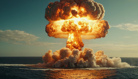 Massive nuclear explosion creates a towering mushroom cloud against a turbulent sky, casting an eerie light over the landscape, symbolizing devastation and energy