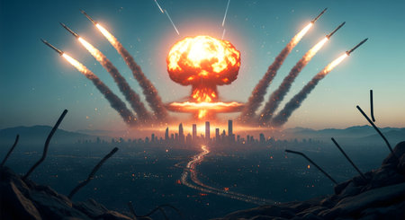 A dramatic scene depicts a modern city under nuclear attack, featuring missiles, a massive explosion, and widespread apocalyptic destruction. This catastrophic event shows the intense impact of warfare.