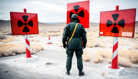 A person in protective gear stands before warning signs with radioactive symbols in a barren desert landscape, suggesting a contaminated area.. AI Generation