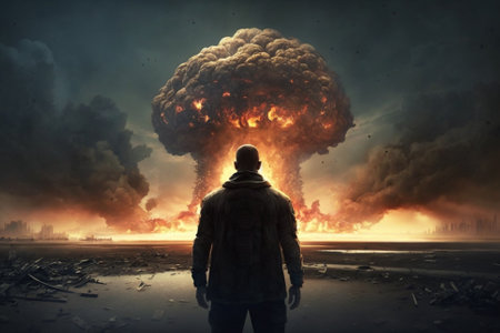 Man witnessing a giant atomic explosion. End of the world, armagedon concept with man and enormous fire explosion blast. Ai generated
