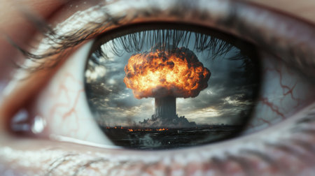 Human eye reflecting massive nuclear explosion, apocalyptic theme, background, AI generated