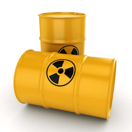3D rendering Yellows radioactive barrels on a white background
