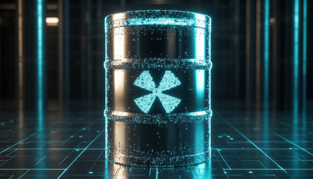 3D rendering of a metal barrel with radioactive waste on a dark background