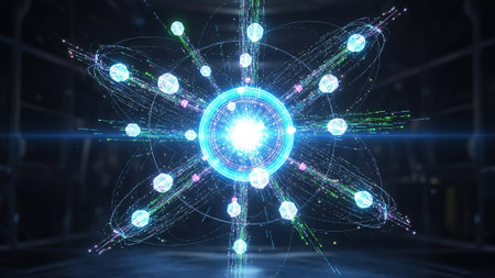 Vibrant atomic model showing particles and energy in motion, illustrating the dynamics of atomic structure against a dark background.