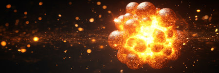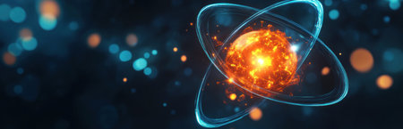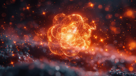 A vivid depiction of an atomic model, highlighted by glowing particles and flames set against a dark backdrop, symbolizing energy and science.