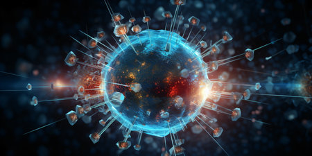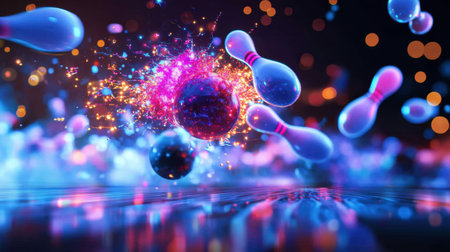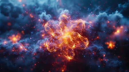 This vibrant abstract image features glowing particles and bursts of light that represent molecular interactions, ideal for scientific and creative projects.