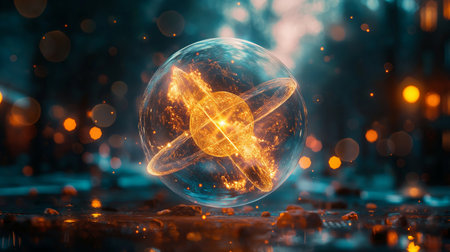 A bright and vivid depiction of an atomic structure, showcasing colorful particles orbiting within a transparent sphere, set against a dynamic, illuminated background.
