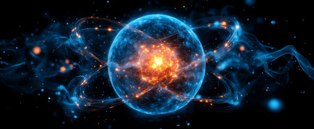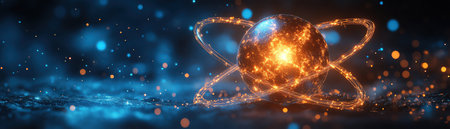 Atomic structure glowing in blue and orange light.