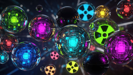 This image showcases a collection of illuminated spheres, each exhibiting vibrant colors and intricate internal patterns. The composition suggests a technological or scientific theme. The lighting and textures add a sense of depth. Suitable for various design projects and could be used for conceptual illustrations.