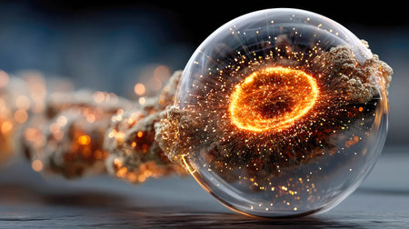 Abstract red energy particle encased in a glowing glass sphere, symbolizing atomic power and futuristic energy concepts.