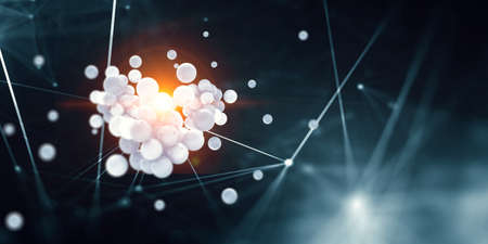 Abstract atom model. Atom is the smallest level of matter that forms chemical elements. Glowing energy balls. Nuclear reaction. Concept nanotechnology. Neutrons and protons - nucleus. 3D Illustration