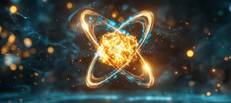 Glowing atomic structure illustration with bright blue energy, against a dark background