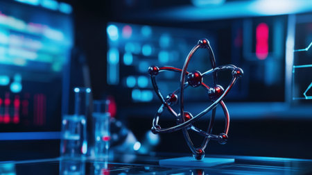 Close-up of a detailed atom model with advanced lab equipment and digital monitors in the background.