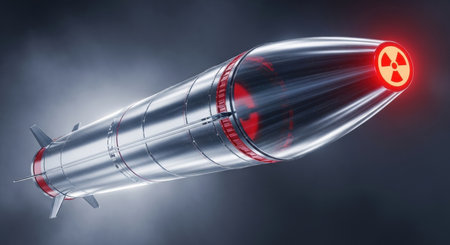 Highly detailed nuclear missile with a red warhead and a prominent yellow radiation symbol, representing global conflict and danger.