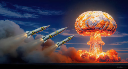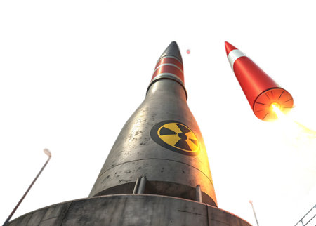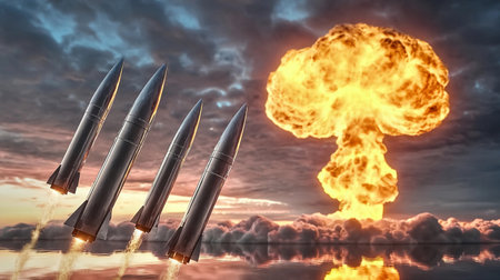 A powerful nuclear missile launches, symbolizing global threat and military power, with a fiery exhaust trail against a dark sky. This image represents themes of conflict, crisis, and technological advancement in weaponry.