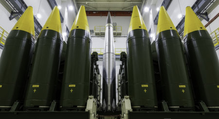 Six large intercontinental ballistic missiles, five dark green with yellow tips and one silver, stand upright in a high security industrial facility. military defense and strategic weaponry.