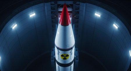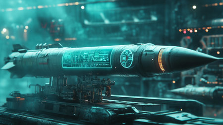 Massive white missile with a red tip and a prominent nuclear radiation symbol stands vertically in a dark, futuristic underground launch silo illuminated by blue lights. represents power, defense, and potential danger.