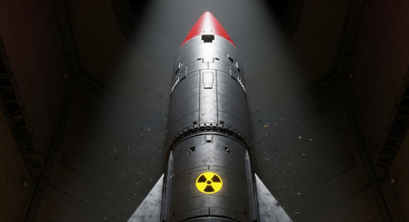 Massive nuclear missile with a red tip and radiation symbol stands vertically in a dark, illuminated underground launch silo, ready for deployment.