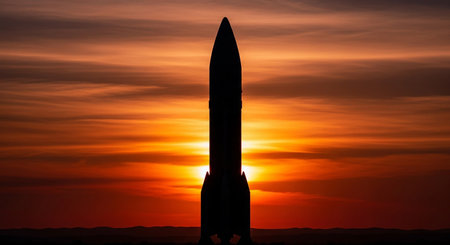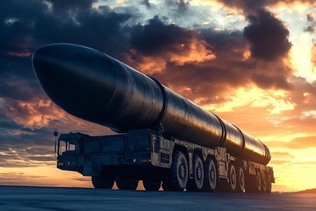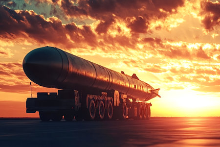 Intercontinental ballistic missile is being moved on a military truck, under a dramatic orange colored cloudy sky during sunset, representing the potential threat of nuclear war
