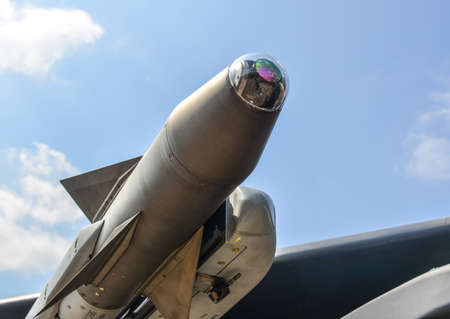 Missiles, bombs, rocket launcher and other guided and unguided armament of fighter jet, modern weapon of aircraft, military industry, selective focus
