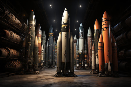 Concentric arrangement of stacked warheads creates a powerful abstract, perfect for conceptual illustrations about defense, aggression, or arms development. Great detail and dramatic perspective.