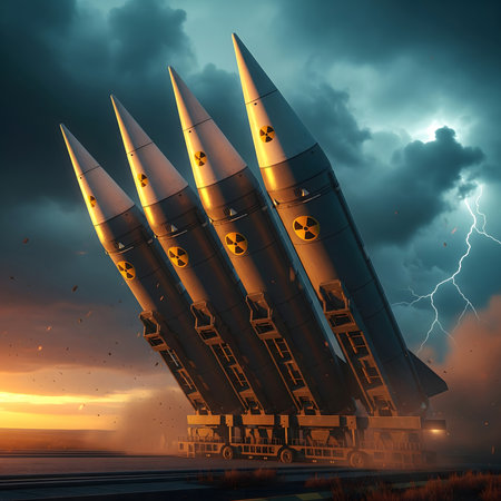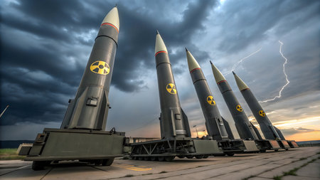 Row of dark grey nuclear missiles, each with a yellow tip and radioactive symbol, lined up under a dramatic, cloudy sky, symbolizing war and danger.